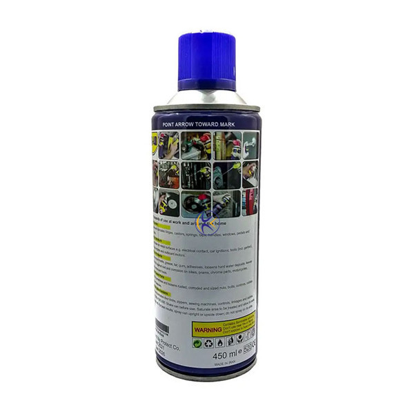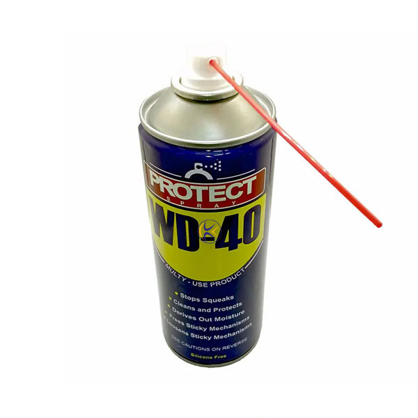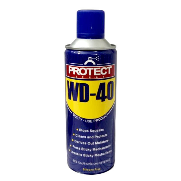 اسپری WD-40 پروتکت Protect ساخت کشور ایران وسیلهای بسیار کاربردی برای مصرف در صنایع خودرو، ورزشی، هوافضا، کشاورزی، کامپیوتر می باشد. این محصول دارای قابلیت روانکاری بسیار عالی و با کیفیت و تمیز کنندگی سطوح از چربی و جرم را دارد. همچنین برای از بین بردن زنگ زدگی و پاک کردن اثر چسب از روی سطوح و تمیزکاری قطعات نیز مورد استفاده است.این محصول دارای حجم 450 میلی لیتر، قطر مخزن 65 میلی متر، مکانیسم فشاری و جنس بدنه فلزی با رنگ آبی می باشد. همچنین از نفوذپذیری بسیار قوی در مکان های غیر قابل دسترس برای روانکاری برخوردار است. این اسپری حالت چسبندگی و جذب گرد و غبار را ندارد و قابلیت محافظت کننده از اجسام بدون مواد سیلیکونی را دارد. از موارد عدم مصرف این اسپری مواد با پایه مشتقات نفت خام آسیب پذیر در برابر اسپری wd40، مانند پلاستیک های پلی استایرن شفاف و پلی کربنات ها هستند.